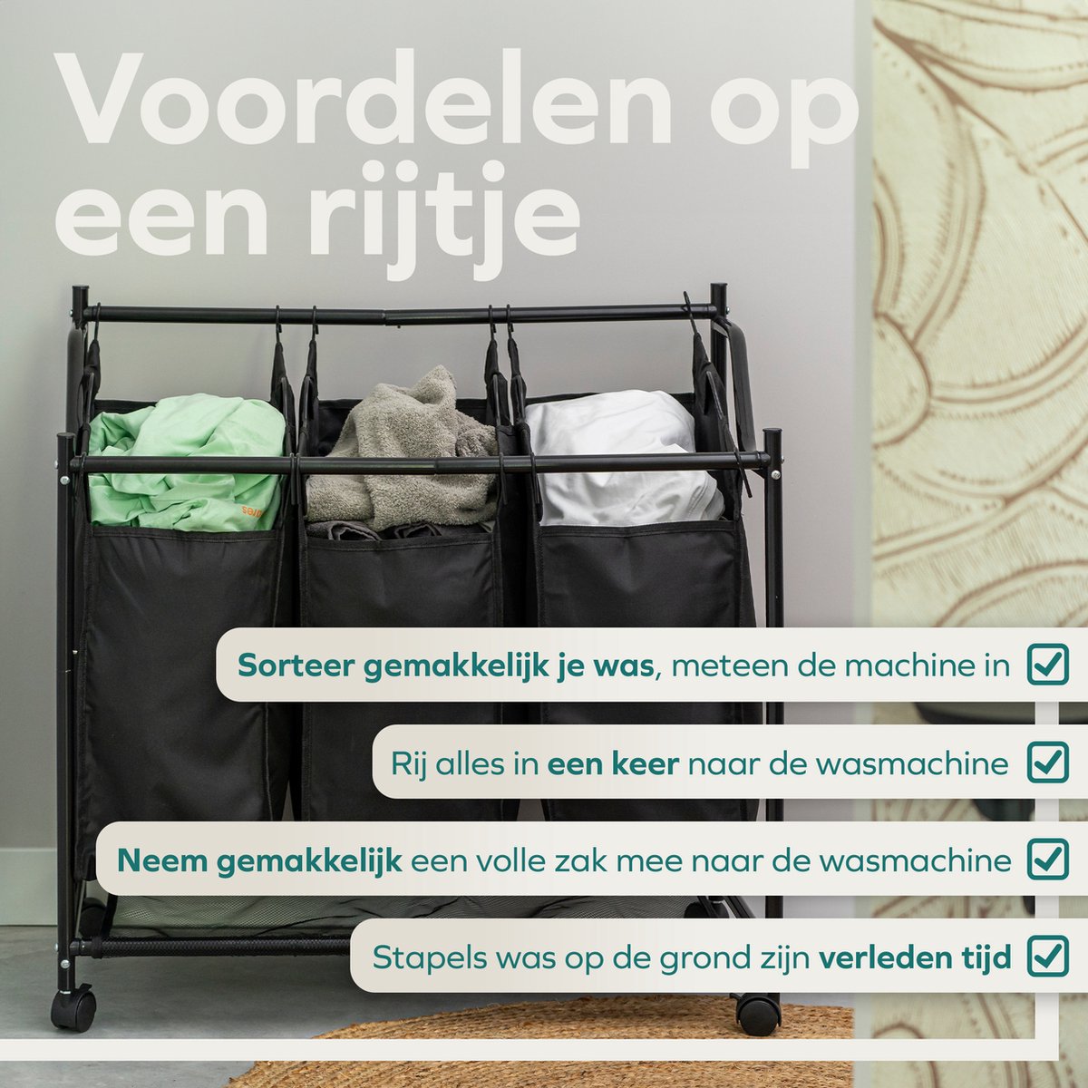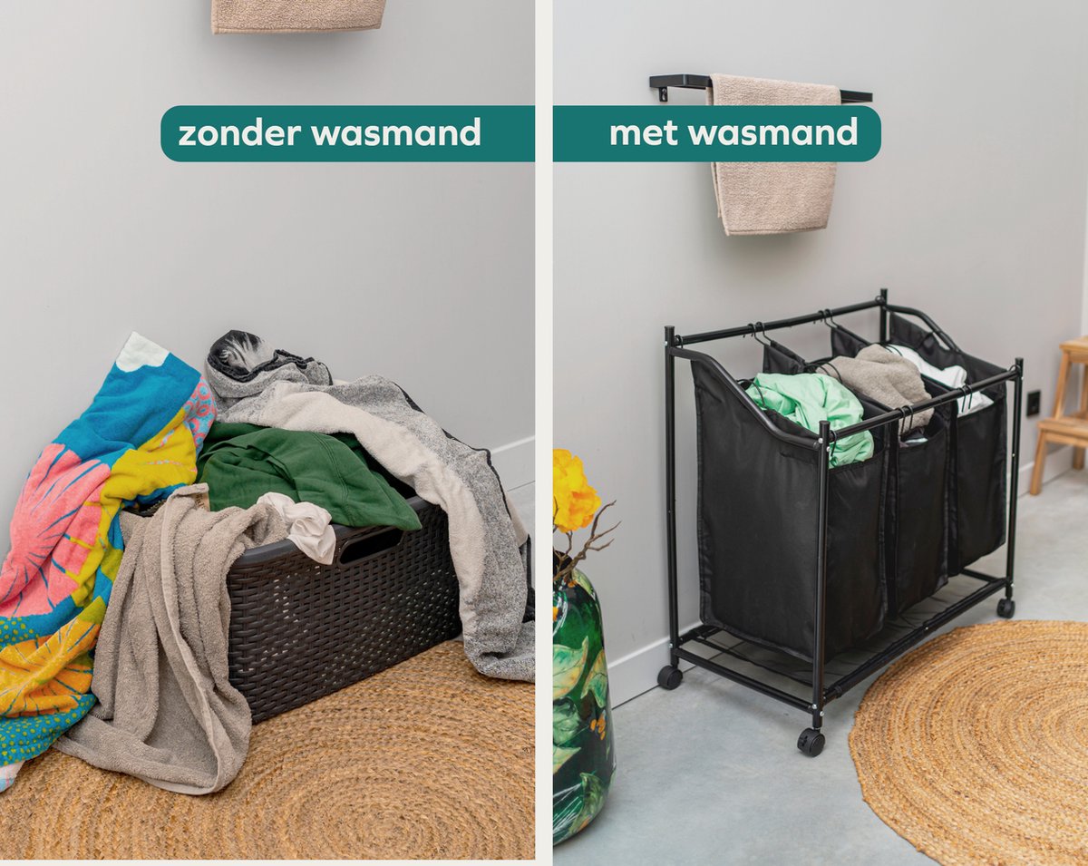 • Direct sorteren: Met drie afzonderlijke, uitneembare waszakken sorteer je je was al tijdens het verzamelen. Scheid je donkere, lichte en delicate was meteen, zodat je op wasdag geen tijd verliest.