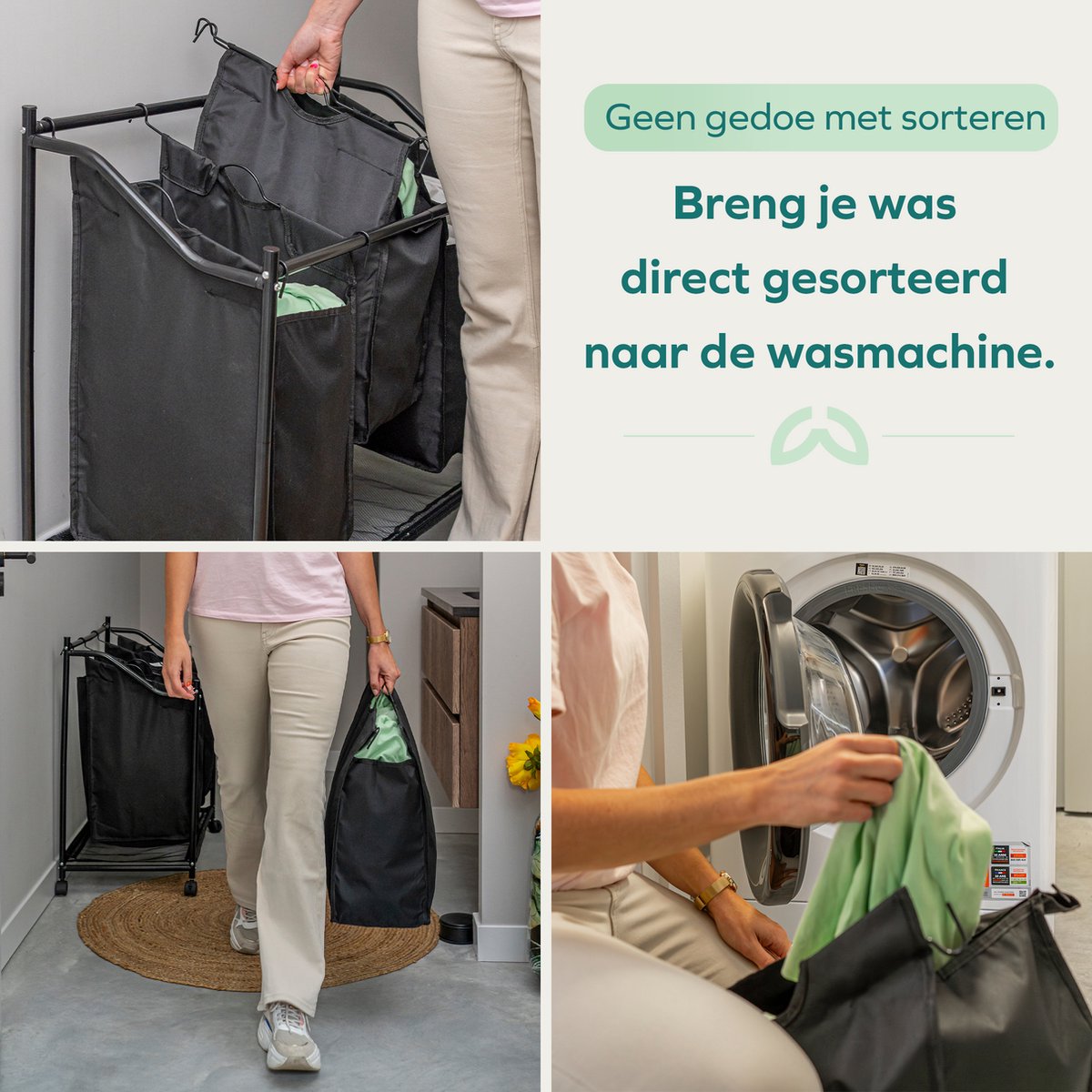 • Draagbare waszakken: De waszakken zijn uitneembaar en hebben een maximale capaciteit van 6 kilo wasgoed per zak. Geen gesleep meer met onhandige manden, pak een zak en ga direct naar de wasmachine.
