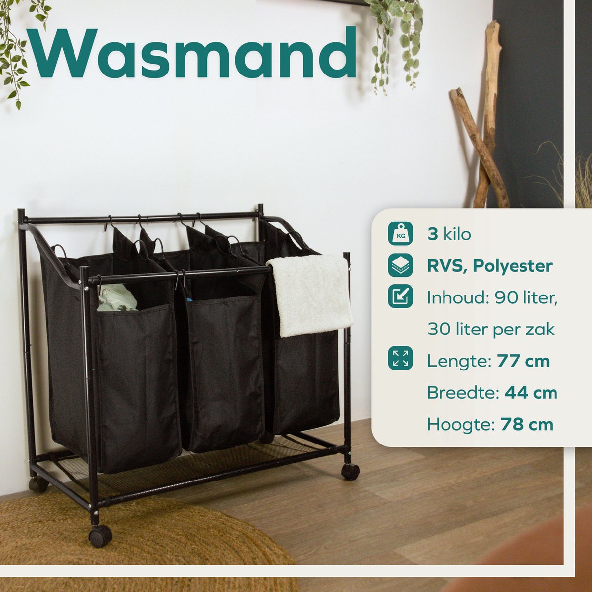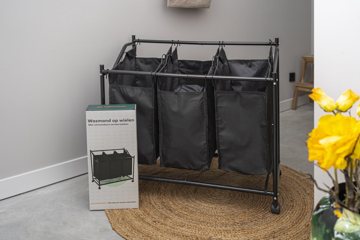 De Wellewares wasmand op wielen neemt je onnodig sorteerwerk uit handen. Je kunt in de afzonderlijke waszakken al direct je was sorteren en daarna eenvoudig uit het stalen frame tillen om het naar de wasmachine te brengen. De waszakken hebben een inhoud van 30 liter per zak, wat gelijkstaat aan maximaal 6 kilo wasgoed. De zakken zijn gemaakt van een stevige ademende stof en hebben handvatten van metaal met een ruime opening zodat iedere hand er gemakkelijk in past.